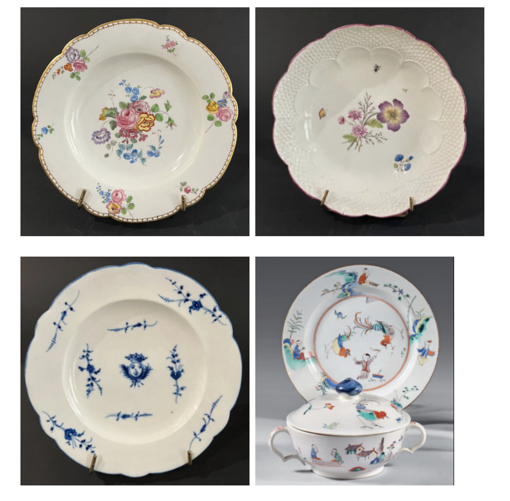 Dernier achat de 2024, dans une vente du 12 décembre qui comportait de nombreux lots de porcelaine de Chantilly, nous avons pu acquérir sept lots dans d’excellentes conditions. Mathieu Deldicque m’a expliqué qu’en dehors des assiettes à la pièce, un lot de sept ou huit n’intéressait pas les acheteurs s’il ne faisait pas partie d’un service connu et reconstituable. Par contre, dans le futur musée Vatel, il est prévu d’installer des vaisseliers pour les assiettes qu’il n’a pas été possible de disposer sur une table.