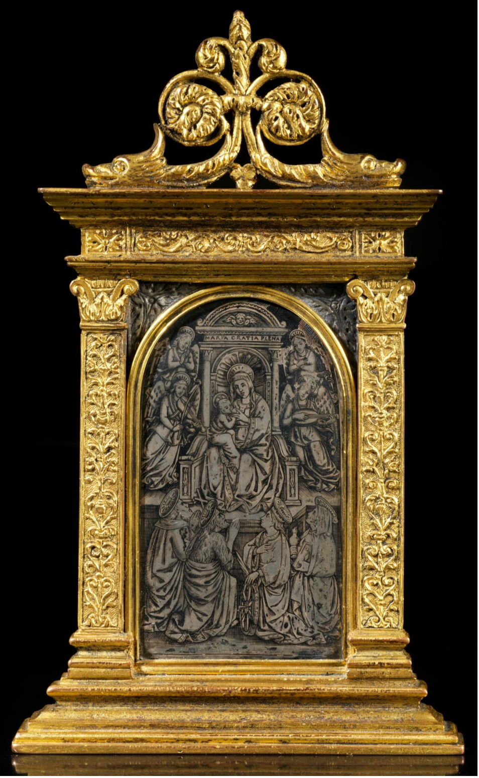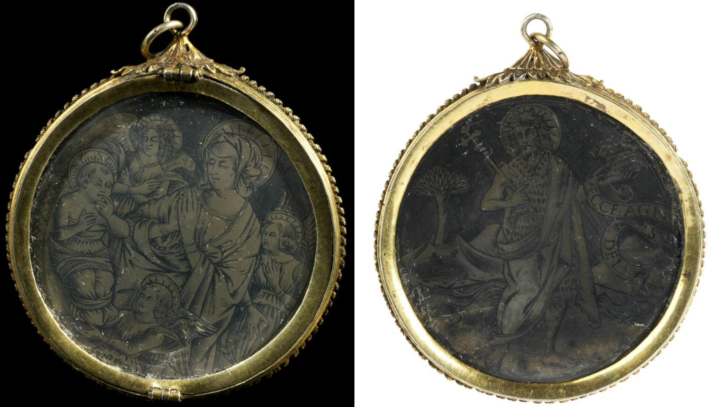 Mais les Dutuit n’ont acheté aucun nielle en métal et il est apparu à la conservation du Petit Palais que l’opportunité si rare d’en acquérir devait être saisie, d’autant que la plus spectaculaire des deux pièces, au format d’un baiser de paix (le Louvre en a plusieurs), avait été vue par les Dutuit et répertoriée dans l’ouvrage d’Eugène sous le numéro 190. Il est d’un très beau style et représente une Vierge à l’Enfant entourée de trois anges et deux saints. Datable de la seconde moitié du XVe siècle et florentin, il est présenté dans un spectaculaire cadre en bronze doré postérieur et sans doute du XVIe. Un discret support plus récent permet de le maintenir en position verticale. L’autre pièce est un médaillon biface ; comme on pouvait s’y attendre, il est composé de deux plaques de mêmes dimensions, l’une avec une Vierge à l’Enfant entourée d’anges et l’autre avec un saint Jean-Baptiste dans le désert. L’époque est la même mais le style est nettement plus fruste. Ces deux pièces seront le complément indispensable de toute exposition des nielles rassemblés par les Dutuit, qui n’ont pas seulement été des collectionneurs mais aussi de vrais historiens de l’art.