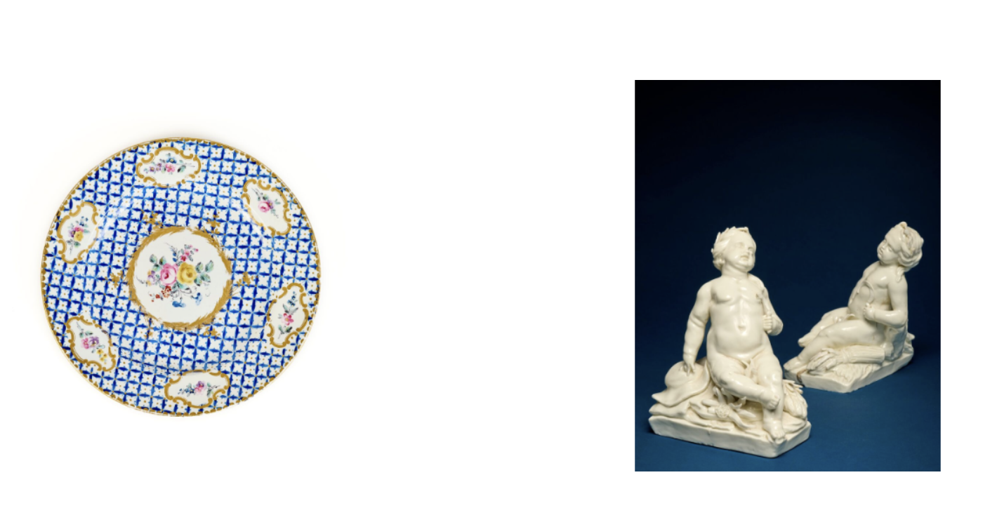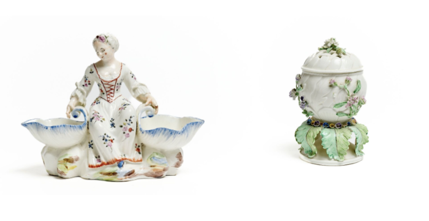 Dans la vente Baron-Ribeyre, on a obtenu d’abord trois lots de pièces de forme en porcelaine émaillée blanc, qui manquaient aux collections. D’abord, deux hotteux, homme et femme, 29 et 28 cm (Le Duc p. 179). La manufacture en a produit toute une série en prenant pour modèles des personnages exotiques, dont les hottes pouvaient être garnies de fleurettes. Ensuite un putto assis, 19,5 cm, qui devait lui aussi faire partie d’un surtout (Le Duc p. 183). Enfin, une paire de « fromagers » (dixit Geneviève Le Duc, mais ce pourrait être des beurriers) à décor de barattes ovales avec une vache couchée sur le couvercle. Ces derniers font partie d’un très rare service conçu sans doute pour la laiterie attachée à la Ménagerie, et une seule autre paire de ce type est connue, au Bowes Museum (Le Duc p. 147). Même si on est loin du raffinement des pièces conçues pour la laiterie de Trianon ou celle de Rambouillet, la rusticité de ce service monochrome est fort plaisante. Sa couleur légèrement crème indique qu’il s’agit d’une fabrication antérieure à l’époque à laquelle le nouveau procédé de Claude Gérin permettant d’obtenir une blancheur parfaite a été mis en pratique.