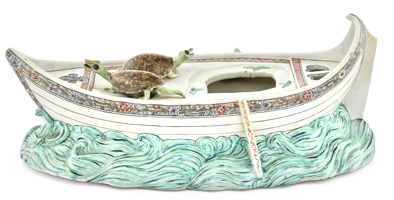 Il semble que l’inspiration de cet ensemble soit chinoise ou japonaise, tout au moins pour la barque posée sur les flots dont on connaît quelques rares exemplaires (une jonque en biscuit de l’époque Kangxi à Dresde, une autre japonaise à usage de brûle-parfum dans la collection royale britannique). Quant aux tortues, on note dans l’inventaire après décès du prince de Condé en 1740 parmi les pièces en porcelaine du Japon des petites pagodes accompagnées de très petites tortues. Les créateurs de la manufacture ont dû extrapoler sur ces exemples et la présence des fleurs de lys laisse supposer une commande particulière du prince lui-même. On regrette juste que cette acquisition soit arrivée trop tard pour figurer dans l’exposition si réussie de Chantilly en 2021, La Fabrique de l’extravagance, porcelaines de Meissen et de Chantilly, où elle avait toute sa place !