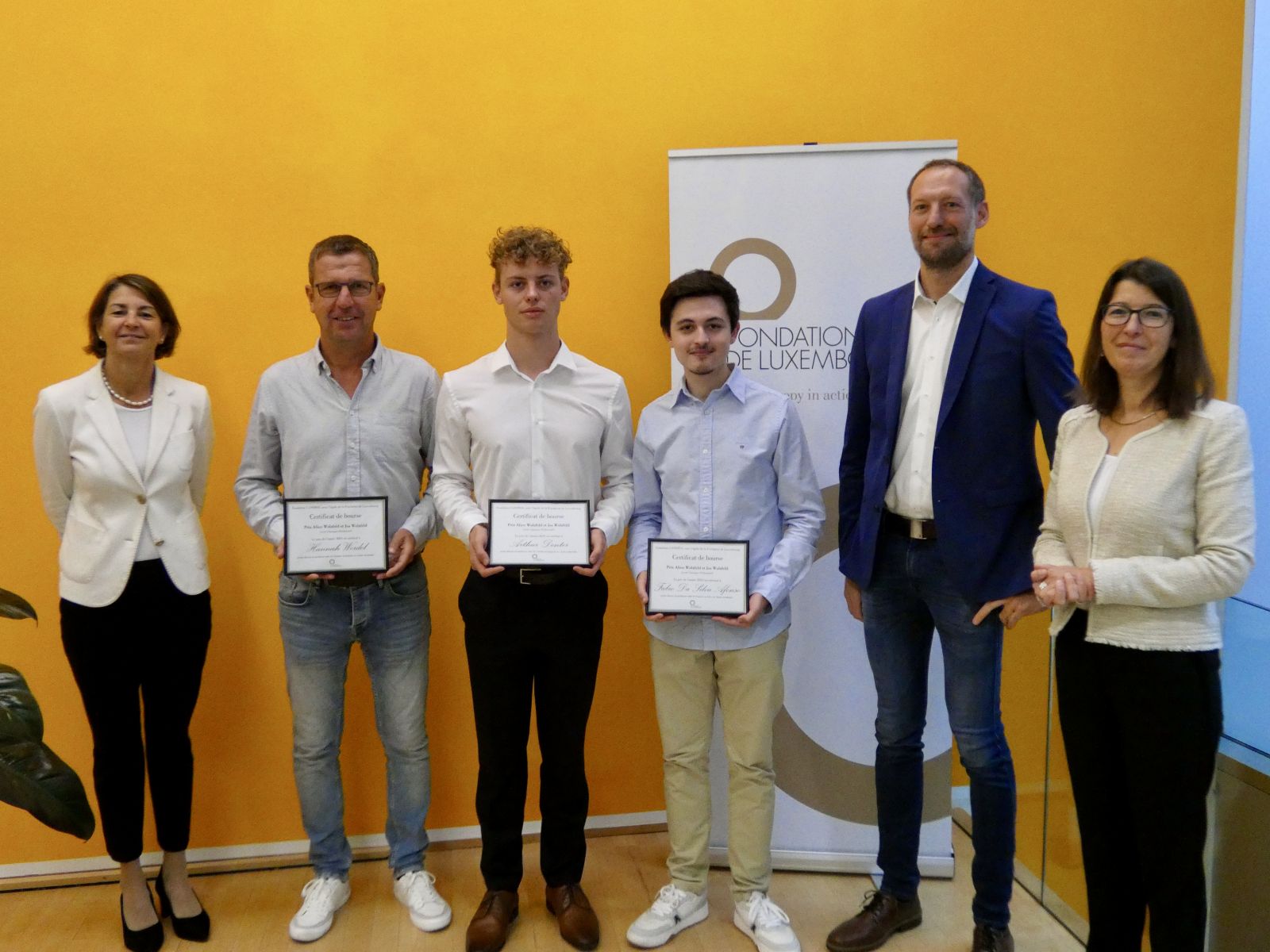 From left : Tonika Hirdman, Director General of Fondation de Luxembourg, Hannah Werdel's representative, Arthur Denter, Fabio Da Silva Afonso, Robert Droulans, Deputy Director of the Lycée classique d'Echternach, and Monique Adams, member of the Fondation CANDIDA.