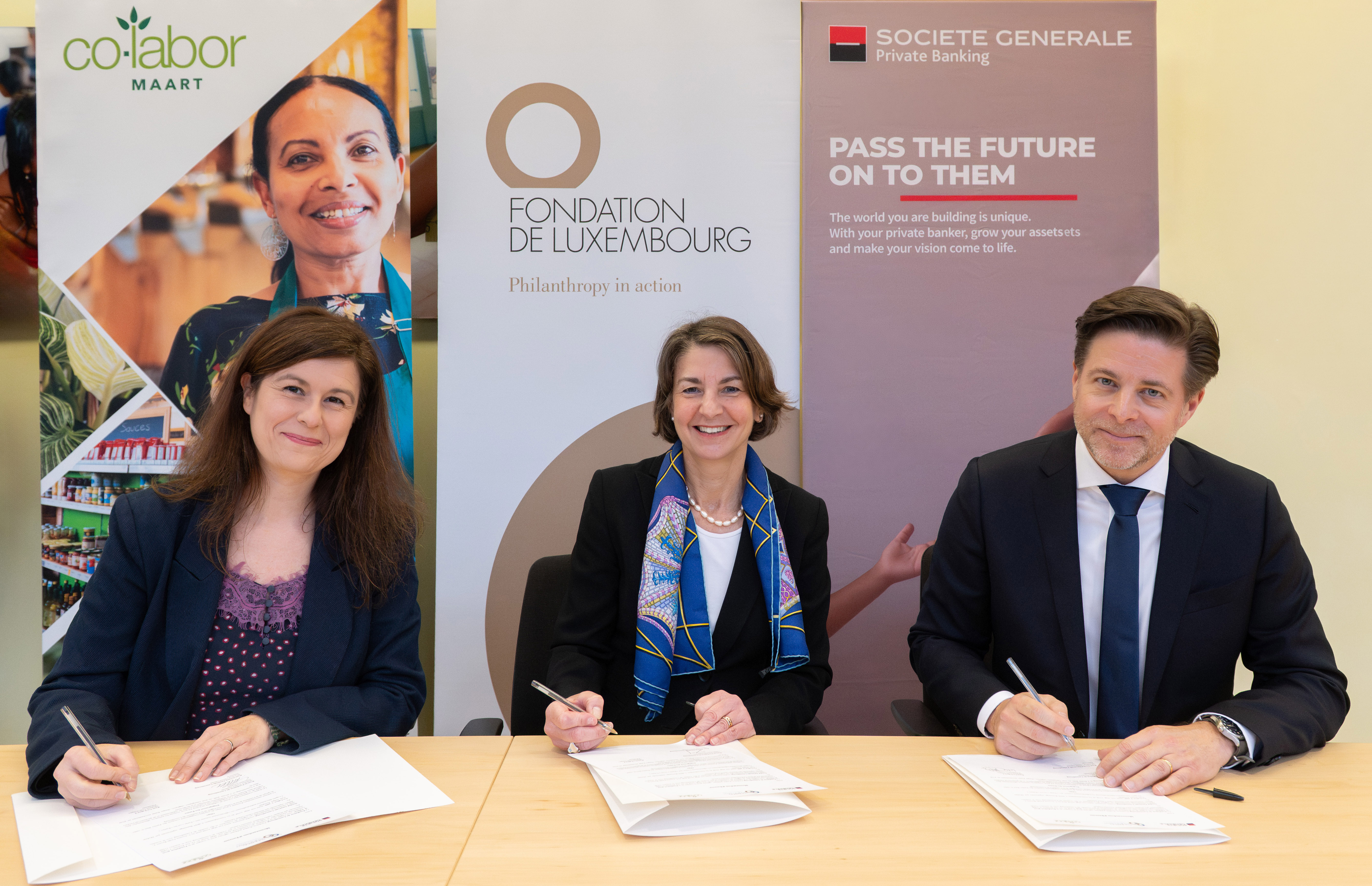 De gauche: Lola Artigao, Présidente de co-labor, Tonika Hirdman, Directrice Générale de la Fondation de Luxembourg, Olivier Gérard, Directeur de Société Générale Private Banking Luxembourg. ©Ramunas Astrauskas
