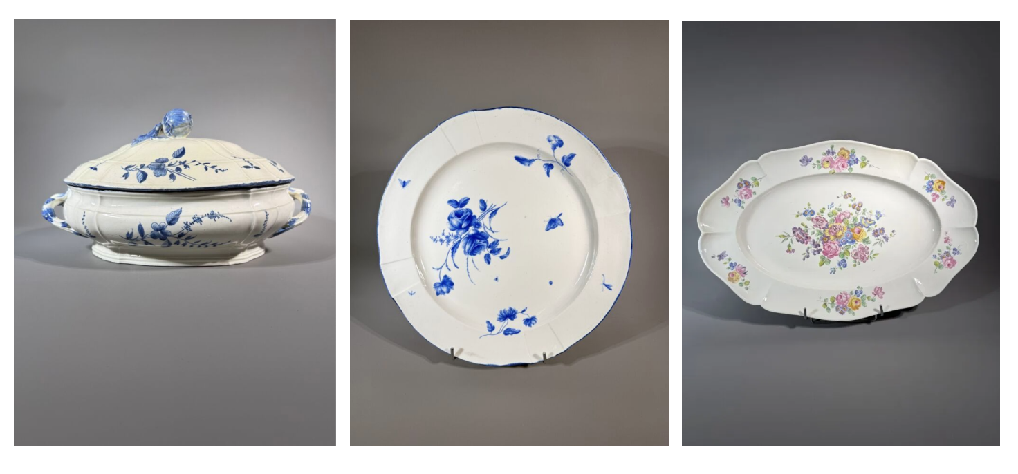 En juin 2024, retour vers les porcelaines. Le 14, dans une vente Coutau-Bégarie, nous pouvons mettre la main sur une partie de service plus rare que les brindilles, il s’agit d’un décor polychrome de bouquets de fleurs ou fleurs jetées que l’on voit souvent passer à l’unité, ce qui peut laisser croire qu’il s’agit de pièces décoratives comme les fleurs fines de Strasbourg. C’est la première fois qu’on en voyait un ensemble ; d’ailleurs Geneviève Le Duc ne le mentionne pas comme tel dans sa monographie. Il se compose de deux compotiers, quinze assiettes creuses et onze plates.