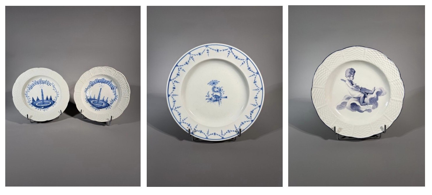 Dernier achat de 2024, dans une vente du 12 décembre qui comportait de nombreux lots de porcelaine de Chantilly, nous avons pu acquérir sept lots dans d’excellentes conditions. Mathieu Deldicque m’a expliqué qu’en dehors des assiettes à la pièce, un lot de sept ou huit n’intéressait pas les acheteurs s’il ne faisait pas partie d’un service connu et reconstituable. Par contre, dans le futur musée Vatel, il est prévu d’installer des vaisseliers pour les assiettes qu’il n’a pas été possible de disposer sur une table.