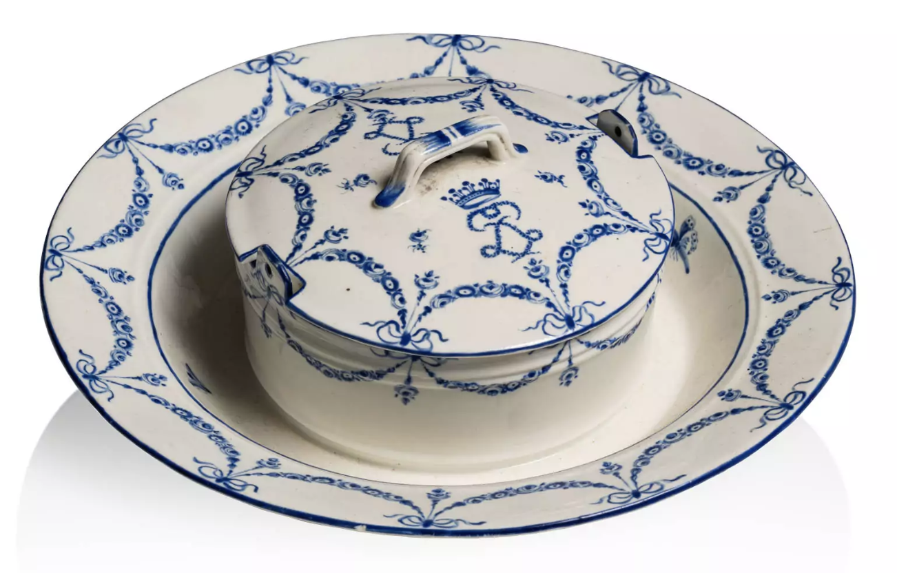 Ont suivi encore huit achats de porcelaines : chez Daguerre, le 28 novembre, une assiette à décor polychrome de bouquets de fleurs, suivie d’une jatte du service de la cour de Parme qui rejoindra une autre pièce de ce service bien esseulée, et d’une assiette du service brindilles qui pourrait bien être un unicum. En effet, la brindille centrale est remplacée ici par les armes des Condé, toujours en camaïeu bleu. L’hypothèse qui prévaut est qu’il s’agirait d’un essai qui n’a pas eu de suite. Chez Thierry de Maigret le 5 décembre, nous avons pu acheter une ravissante écuelle à bouillon et son présentoir, dans un style kakiemon particulièrement réussi.