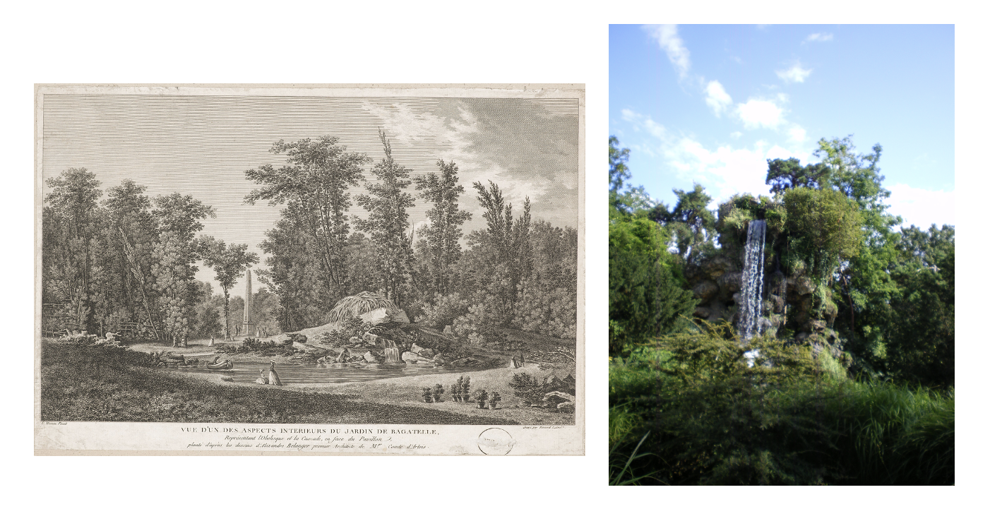 Le château de Bagatelle est un pavillon construit en lisière du Bois de Boulogne par le comte d’Artois en 1777. Sa belle-sœur, Marie-Antoinette, l’avait mis au défi de l’édifier en cent jours ; il l’a réussi mais a dû pour cela détourner des convois de matériaux à destination de Paris. Le résultat est typique des folies XVIIIe, exquis de proportions, avec au nord un grand salon en rotonde sous un dôme, orné de stucs d’un extrême raffinement dessinés par l’architecte Bélanger, flanqué de deux boudoirs, l’un décoré par Callet, l’autre par Hubert Robert.